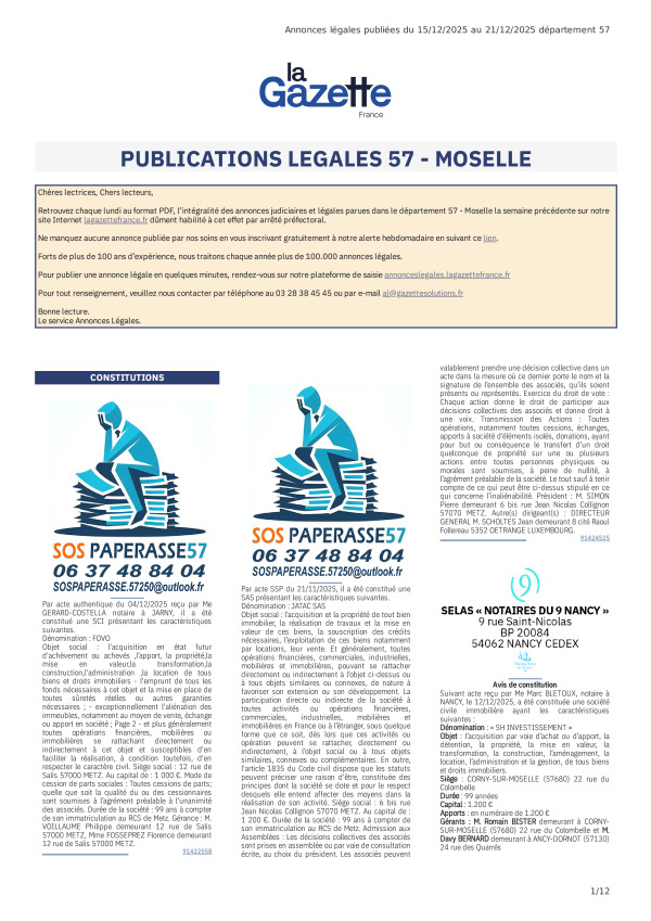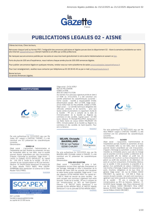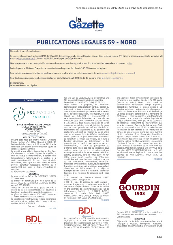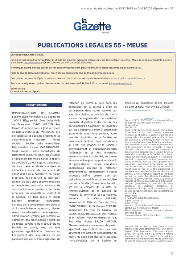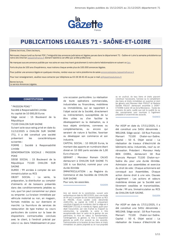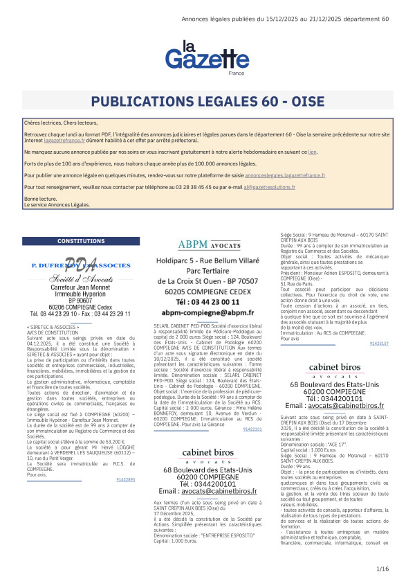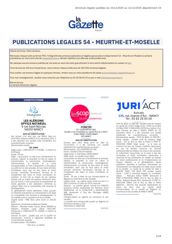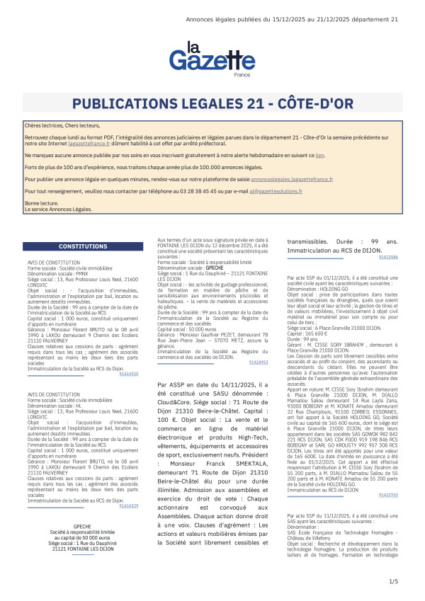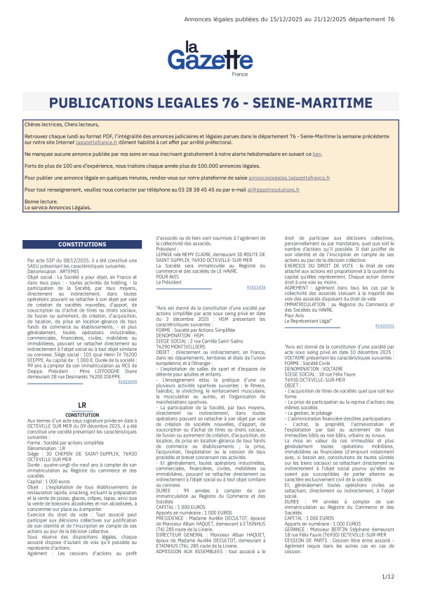 Annonces légales publiées du 15/12/2025 au 21/12/2025