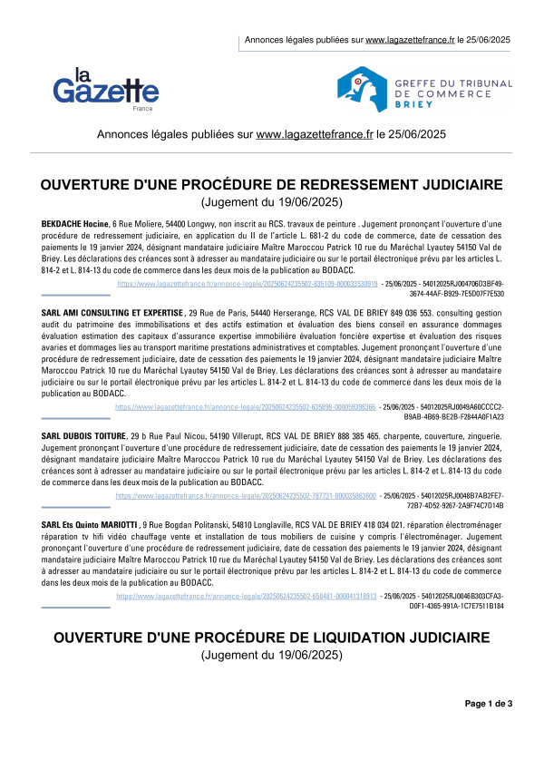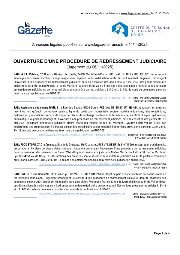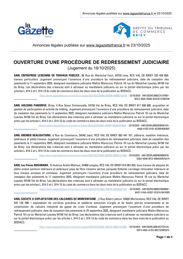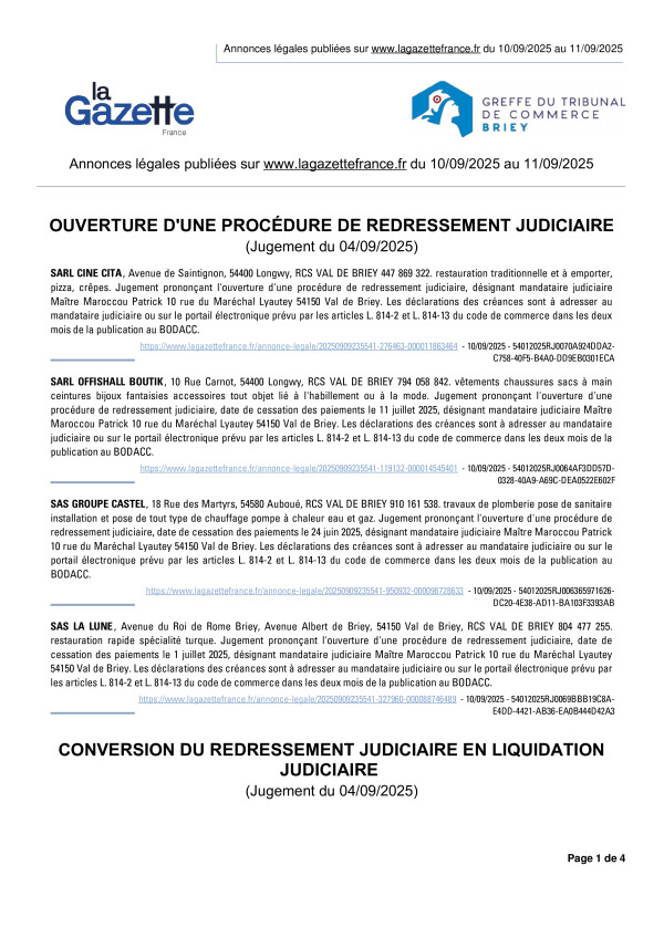 Annonces légales publiées du 10/09/2025 au 11/09/2025