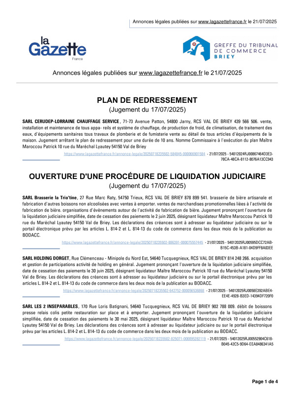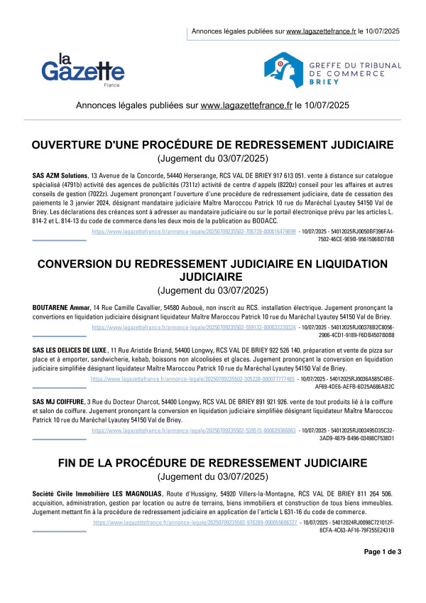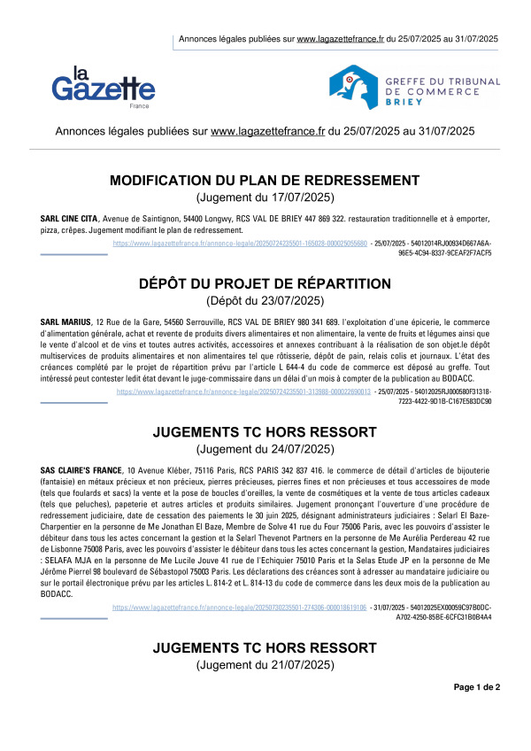 Annonces légales publiées du 25/07/2025 au 31/07/2025