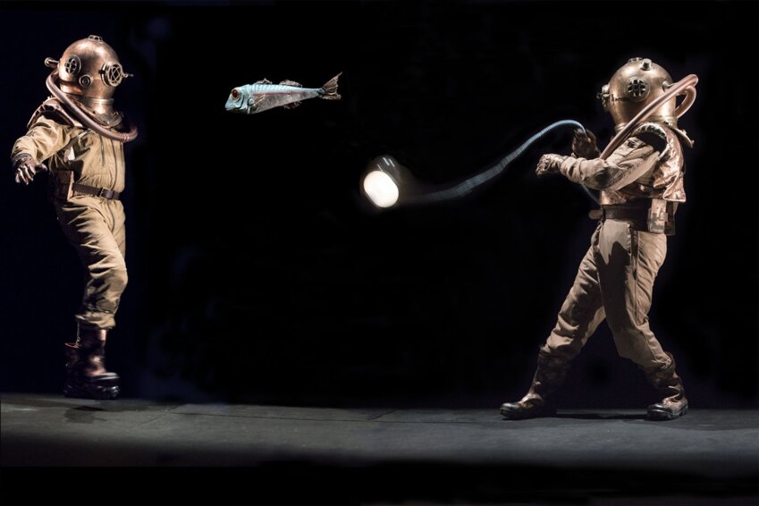 Après Le Voyage de Gulliver et La Mouche, le comédien et metteur en scène Christian Hecq et la plasticienne Valérie Lesort co-signent une remarquable adaptation du célèbre 20 000 Lieues sous les mers de Jules Verne. Le récit met en scène le professeur Aronnax, son fidèle domestique Conseil et le harponneur Ned Land qui se retrouvent prisonniers du capitaine Némo à bord de son sous-marin le Nautilus. Ce pirate moderne leur fera vivre la plus grande aventure de leur vie, entre découvertes scientifiques et exploration des merveilles de l’océan. Dans le noir des profondeurs, joliment scénographiées par Éric Ruf, les acteurs sont aussi marionnettistes et manipulent cette faune sous-marine avec une fluidité toute aquatique. Une plongée virtuose et pleine d’humour dans l'univers fantastique et poétique de l'œuvre de Jules Verne.