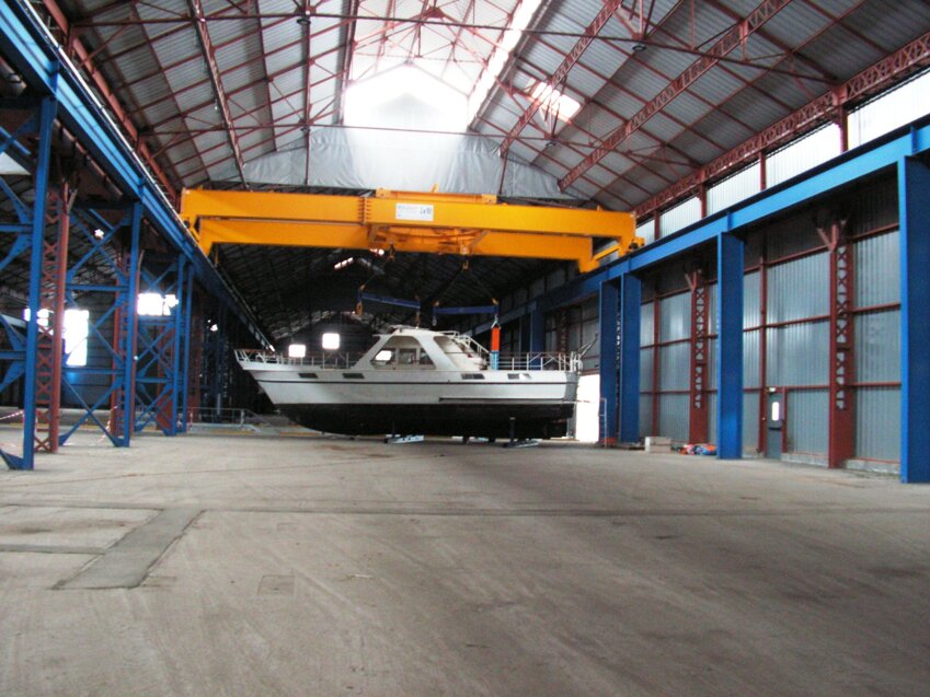 Une vue intérieure d’une des halles industrielles réhabilitées. Les travaux sont terminés depuis le printemps. Deux ponts roulants permettent de manipuler les gros bateaux ou le fret.
