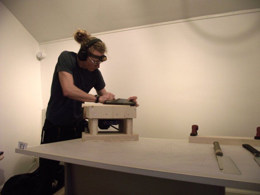 Durant le premier jour, les concurrents ont dessiné une charpente traditionnelle à l’échelle – le tracé de l’épure. Le lendemain était consacré à la taille et au rembarrement en maquette à partir du dessin. Tous présentent la même pièce, une charpente modèle réduit, de 50 cm de hauteur. Autant d’étapes que les visiteurs du musée ont eu l’occasion d‘observer.