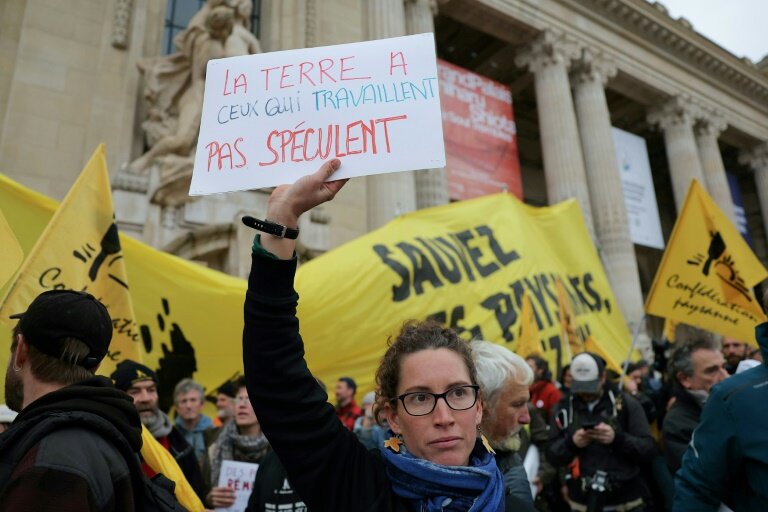 "Sauvez les paysan.n.es, mangez un trader", proclamait une grande banderole jaune aux couleurs du syndicat, déployée sur le parvis du monument par les manifestants venus dénoncer la dérégulation des marchés.