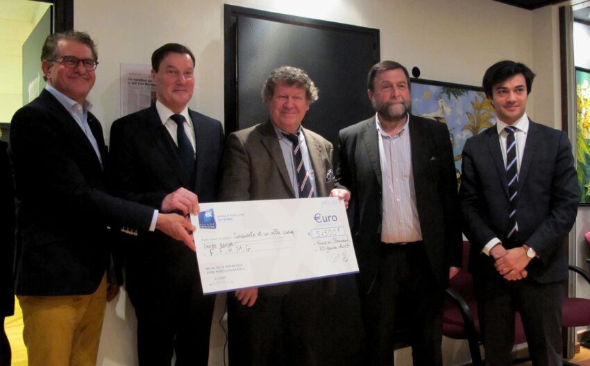 Gilbert Thiriez et Guy Loyez (à gauche) ont remis un chèque de 51 500 € au professeur Fermand, président de la FFRMG (2e en partant de la droite).