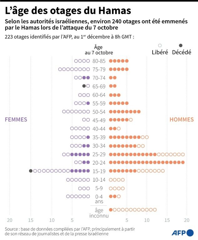 Les données qui suivent analysent les 108 otages présumés vivants toujours à Gaza que l'AFP est parvenue à identifier au 1er décembre, principalement grâce à son réseau de journalistes en contact régulier avec des familles d'otages et à la presse israélienne.