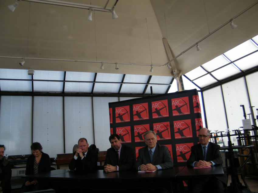 A droite, Xavier Ibled, membre de la famille Durand resté au capital, puis Pierre de Saintignon, vice-président du Conseil régional, et Didier Riebel, directeur du site arquois avec quelques délégués syndicaux.