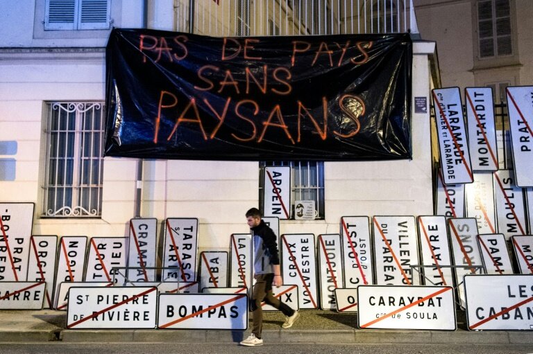 "Pas de pays sans paysan" et "Paysan, ma passion, mais quelle déception", pouvait-on lire sur des banderoles déployées par les manifestants qui ont accroché ces panneaux de sortie d'agglomération à la grille de la préfecture, répondant à l'appel des Jeunes agriculteurs (JA) et de la FDSEA 09.