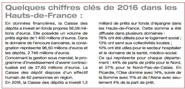 M. M-L. et G. V. : Les projets de la Caisse des dépôts de 2017 portent sur les impactes sociaux économiques. Avec la volonté d’agir pour l’emploi, accroître la production d’énergies renouvelables et améliorer le bilan carbone. Être le partenaire privilégié des bailleurs sociaux, favoriser l’aménagement équitable des territoires, encourager la jeunesse, et contribuer aux rayonnements des Hauts-de-France. Dans la région, nous travaillons beaucoup sur la partie logements sociaux et sur des conventions pluriannuelles, (ce qui signifie passer un accord avec un bailleur social sur les financements des plans du développement sur 18 à 24 mois). Nous souhaitons développer cette politique en Picardie. Puis, que la Caisse des dépôts reste le soutien des TPE. Cette année, nous avons injecté 7,3 millions d’euros pour financer la création de plus de 2 500 TPE.