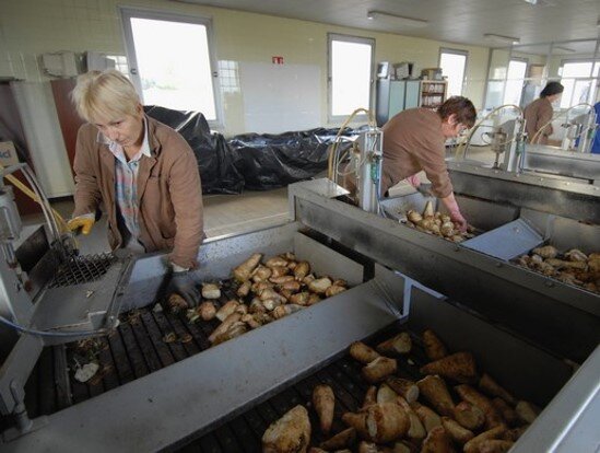 Chaque année, 60 000 tonnes de racines sont traitées. Le produit est cultivé dans les Haut-de-France, essentiellement entre le cap Blanc-Nez et la frontière belge (60%), dans la Somme (20%) et à Orchies (20%). Près 200 planteurs collaborent avec l’entreprise, dont 90% à travers une agriculture conventionnelle et 10% une agriculture bio. La saison de séchage dure environ deux mois et fait appel à des saisonniers locaux : 55 personnes, situés dans un rayon de 15 km autour de Vieille-Eglise. Suite à la réception de la racine se succèdent les étapes de lavage, de découpe en lamelles, de séchage en four de déshydratation. Les cossettes obtenues sont conservées sur place et livrées tout au long de l’année à l’usine d’Orchies pour la transformation en produits finis. La torréfaction intervient alors, suivie par le concassage afin d’obtenir des grains, puis le criblage (calibrage à un format homogène) et le conditionnement en sachet. Le circuit de distribution est axé sur la grande distribution et les magasins bio. Le produit traditionnel est un paquet de grains à mélanger avec le café, mais les produits solubles remportent un vif succès. Les propositions se sont diversifiées au fil du temps : la chicorée liquide est adaptée à l’élaboration de recettes pâtissières ou de sauces. Des sticks, en doses unitaires, s’adaptent aux compositions familiales. Des infusions sont également proposées. Une gamme de biscuits salés ou sucrés bio complète le tout. L’entreprise fait appel régulièrement à des grands chefs afin d’élaborer des recettes à base de chicorée, proposées par la suite sur le site internet de l’entreprise.
