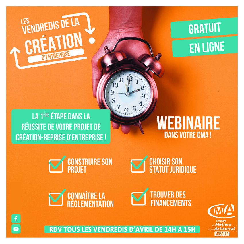 Les traditionnelles Réunions d’information à la Création-Reprise d’entreprise proposées par la Chambre de Métiers et de l’Artisanat de Moselle sont remplacées par des webinaires à compter de vendredi et ce, pour tout le mois d’avril.