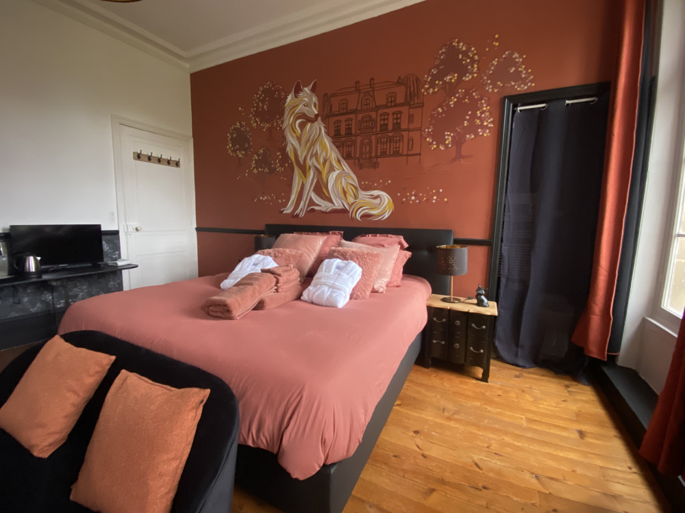 En parallèle, le couple a décidé de créer quatre chambres d’hôtes et une suite au premier étage sur la thématique du… loup. Elles sont disponibles depuis la fin d’année. Toutes portent des noms évocateurs comme la chambre des sortilèges, la tanière de Terra. De belles fresques signées Angèle Ethuin, designer d'intérieur & coloriste à Abbeville, ouvrent à l’imaginaire : «On raconte qu'il fut un temps, bien avant que le domaine ne soit un refuge élégant pour voyageurs en quête de sens, il n'était qu'un ancien relais de chasse, enfoui dans les bois, battu par les vents de la baie et veillé par une meute silencieuse, se met à conter avec malice Juliette Charley. Cinq Loups. Cinq destins entremêlés comme les branches d'un vieux chêne. Cinq chambres, cinq atmosphères avec un fil rouge : la meute. Et derrière les murs, les histoires d'une famille de loups pas comme les autres…»