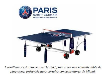 Investir de nouveaux terrains de jeu Dotée d’un panneau bleu PSG en résine stratifié cinq mm ultra durable, d’un traitement antireflet Softmat et d’un filet à mailles blanches hexagonales, elle promettrait « des duels endiablés et des matches à prolongation », selon l’entre-prise. Ses grandes roues offriraient une agilité inégalée alors que ses pieds avec patins de réglage donneraient à la table des appuis parfaits en position de jeu : « Amis fans du ballon rond et du PSG, la balle est désormais dans votre camp et surtout pas au fond du filet ! », assure la marque. « La passion des joueurs de foot de haut-niveau, et peut-être de ceux qui les supportent, pour le ping-pong n’est plus un scoop, explique Cédric Corre, responsable marketing et communication. Notre motivation commune est d’aller sur de nouveaux territoires pour les deux marques. Nous collaborons avec le PSG sous forme de licence officielle. La table Cornilleau-PSG vue à Miami est un preview pour accompagner la tournée américaine du club. Nous avions à cœur de débuter notre collaboration en présentant les premiers produits dans les concept-stores les plus pointus de Miami ! » La table de ping-pong sera commercialisée 450 euros et sera accompagnée d’un set de raquettes ainsi que d’une boîte de balles PSG.