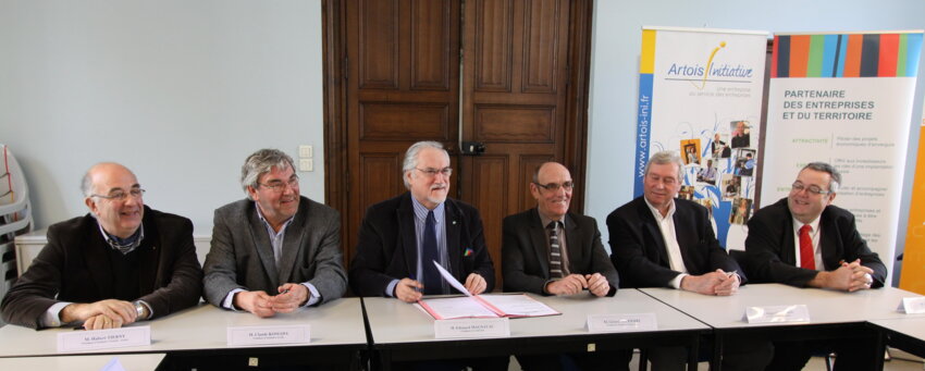 De gauche à droite, les signataires de la convention "fonds de transition TPE" : Hubert Tierny, président d’Initiative Ternois-Artois, Claude Kosiada, président d’Initiative Artois, Edouard Magnaval, président de la CCI Artois, Gérard Delpierre, président d’Initiative Grand-Arras, Roger Delmarre, président d’Initiative Gohelle, en présence d’Eric Berton, directeur général de la CCI Artois.