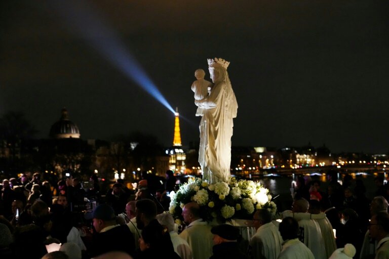 Cinq ans après avoir réchappé de l'incendie de la cathédrale Notre-Dame de Paris, la célèbre statue de la Vierge à l'Enfant a retrouvé vendredi "sa maison" accompagnée à la nuit tombée par des centaines de fidèles en procession, cierge à la main, dans le coeur de la capitale.