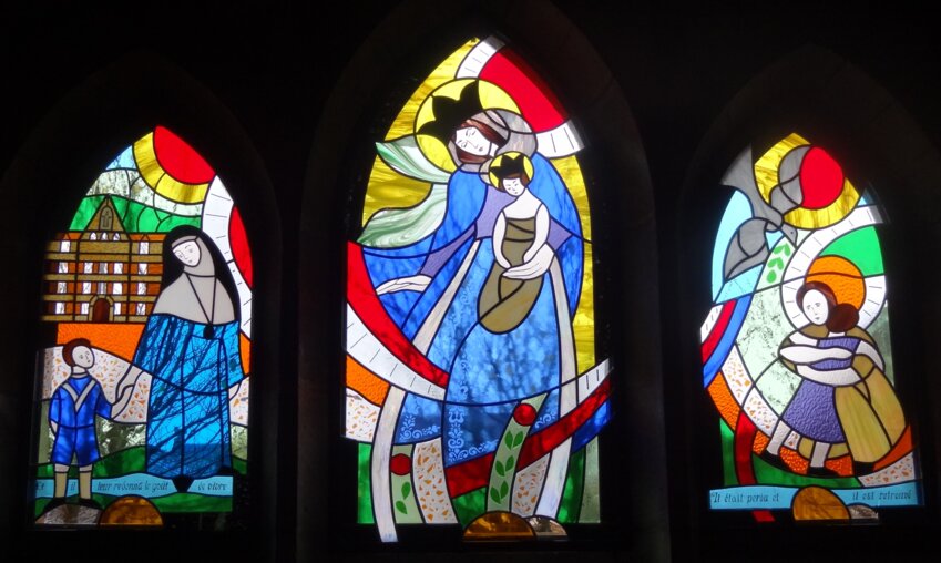 «Dans le lieu qui avait été choisi dans l’église, nous avons découvert quelques lettres peintes sur les murs qui nous orientaient vers l’enfant prodigue et que j’ai représenté sur la partie de droite. Les thèmes se révélaient naturellement : l’accueil de l’enfant, la compassion, le pardon et la protection. Il m’est apparu comme une évidence de représenter les Servantes de Marie : elles avaient la vocation d’accueillir les orphelins dès 1865 et de porter assistance aux personnes malades à travers le centre de soins infirmiers. Suite aux recherches dans les archives à Anglet, siège de la congrégation, j’ai proposé de représenter la Vierge couronnée qui porte l’Enfant Jésus, lui aussi couronné. La Vierge a une main tendue, protectrice vers la Servante de Marie et l’orphelin. J’ai retenu la phrase du père Louis-Edouard Cestac, fondateur de la congrégation : ‘Et il leur redonna le goût de vivre.’ Le style d’écriture a été réalisé par une religieuse du couvent des Bernardines à Anglet. Je tenais à cette participation symbolique qui donnait plus de sens encore à l’œuvre et rendait plus profond et vivant mon travail. Pour l’enfant prodigue, nous avons choisi ensemble un passage de l’Evangile : ‘Il était perdu et il est retrouvé.’ J’ai créé un lien entre chaque vitrail en organisant la structure du dessin que je voulais − dynamique − et une unité grâce à l’interprétation technique en utilisant le fusing, le thermoformage, le sablage, le travail du verre, le choix des couleurs, l’opacité et la transparence. L’ensemble donne une vision plus contemporaine.»
