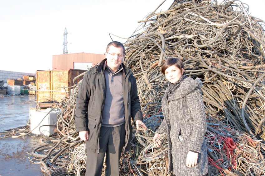 Damien et Tiphaine sur le parc de retraitement de Coenmans devant un lot de câbles qu’ils ont su apporter à l’entreprise.