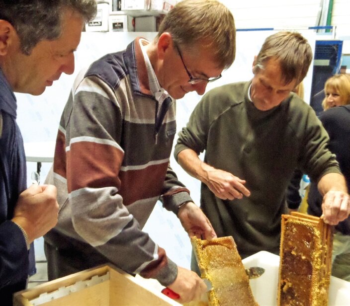 Les dirigeants des entreprises marraines des ruches ont participé à la récolte du miel de "leurs" abeilles avant de le goûter.