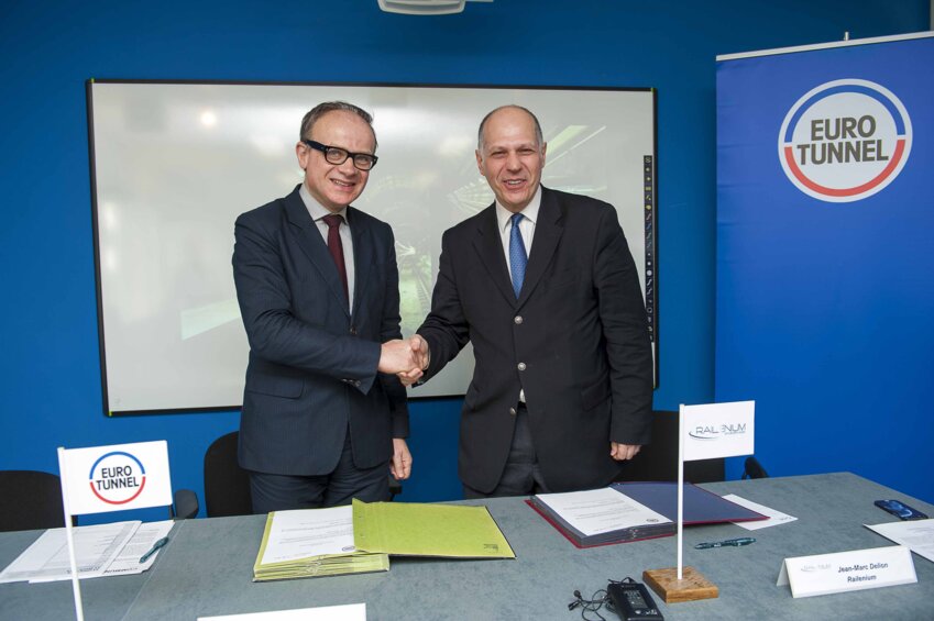 Michel Boudoussier, directeur général de Groupe EuroTunnel (à gauche), et Jean-Marc Delion, délégué général de Railenium.