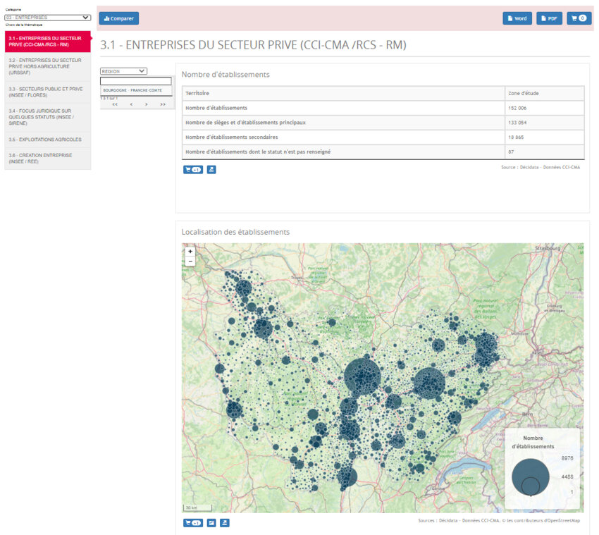 A l’heure actuelle, chaque usager pourra librement télécharger les informations portant sur le territoire de la Bourgogne-Franche-Comté, son commerce extérieur et ses offres de formation. En principe, les données sont représentées sous forme de tableaux, de graphiques, de cartes voire d'études récentes.