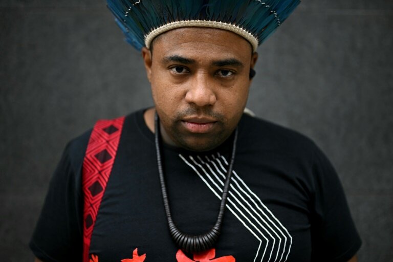 "Mon peuple, ma culture ont toujours été liés au fleuve" mais "tout l'écosystème autour de la rivière a été détruit", raconte Marcelo Krenak, arborant une coiffe traditionnelle de plumes bleues qui attire les regards en plein centre de la capitale britannique.