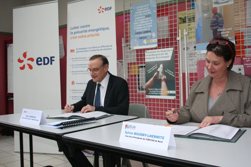 Sylvie Boudry-Lhermite, vice-présidente de l’Union départementale des CCAS, et Alain Laruelle, directeur EDF commerce région Nord-Ouest.