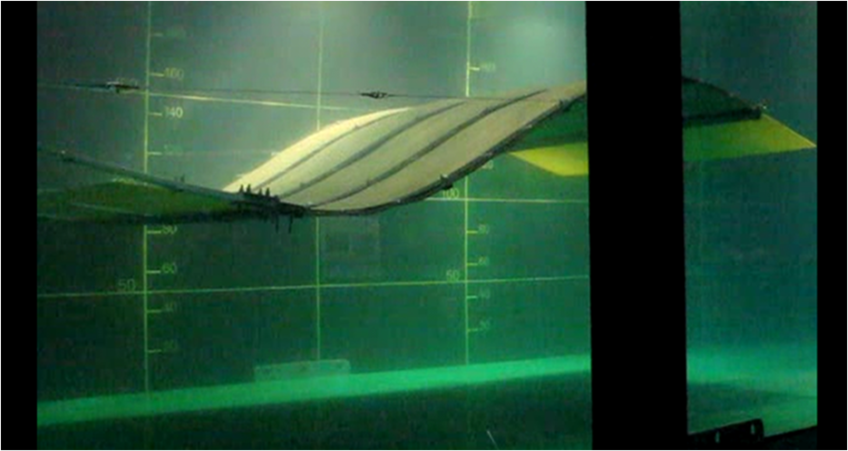 Le développement de cette hydrolienne s’effectue dans le cadre d’une thèse cofinancée Eel Energy/ADEME. Eel a conçu une membrane précontrainte qui, en ondulant sous l’effet des courants, transforme l’énergie mécanique des oscillations de la structure en énergie électrique. Le prototype à l’échelle 1/6 est testé au bassin d’expérimentation d’Ifremer, doté d’un système de simulation de la houle et des courants, qui était jusqu’alors surtout utilisé pour tester des trains de pêche. Les essais en mer auront lieu cette année. En taille réelle, la structure fera 16 mètres sur 16, pour un poids de 234 tonnes.