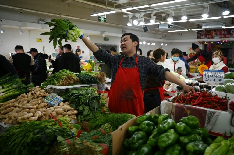 Dans un marché du centre de Pékin, clients et vendeurs font peu de cas de l'entrée en vigueur lundi de droits de douane sur une gamme de fruits, légumes et autres produits importés des Etats-Unis.