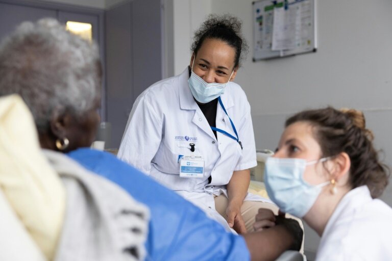 Assise sur le lit, le Dr Isabelle Triol, cheffe de service soins palliatifs sur trois sites en région parisienne dont l'hôpital Antoine-Béclère AP-HP lui tient la main et échange quelques mots avec sa fille, tandis qu'Emma Renard, psychomotricienne, s'enquiert du moral de la patiente.