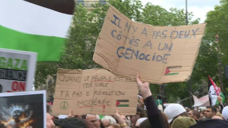 "Hier, des Palestiniens ont été brûlés vifs par des bombardements israéliens sur un camp de réfugiés. On a vu des vidéos de familles qui tirent leurs proches de tentes enflammées. C'est le massacre de trop", a dénoncé François Rippe, vice-président de l'Association France Palestine solidarité (AFPS), un organisateur du rassemblement.