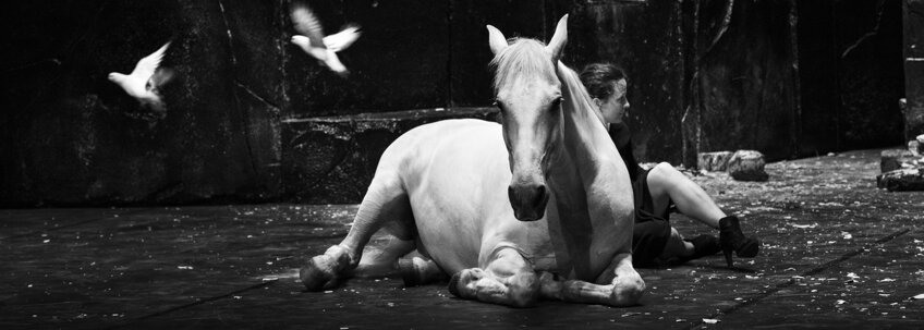 Dans Là, créé en 2018 par la compagnie, tout était blanc. De ce blanc qui reste quand on a tout enlevé. Un blanc où la vie refusait pourtant d’abdiquer, un blanc éclaboussé par le noir d’un corbeau-pie, surprenant compagnon de danse de Camille Decourtye et Blaï Mateu Trias dans leur allégorie fantasmagorique de l’existence. Aujourd’hui dans Falaise, second volet de son diptyque, tout est noir. Le noir d’un monde dévasté, anéanti. Le noir d’un monde en pleine obscurité, dans lequel une poignée d’êtres humains, des pigeons et un cheval blanc cherchent à survivre pour pouvoir tout réinventer.