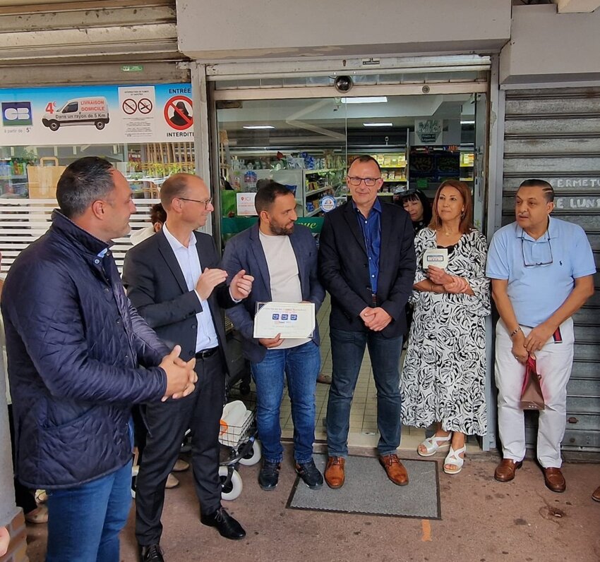 Pierre-Vincent Langlois, élu de la CCI Rouen Métropole vient de remettre le diplôme du "3e Sourire" de la JNCP à Nicolas Rouly, Maire de Grand-Quevilly. L’événement s’est tenu mercredi 5 juillet dans les locaux de la supérette "Au Petit Panier", en présence de Essaïd Ezabori, adjoint au maire en charge du commerce, du développement économique et de l’emploi et de Joffre François, Président de l’association des commerçants "Grand-Quevilly Développement". Pour sa 3e participation en octobre 2022, la commune et ses commerçants se sont engagés fortement pour promouvoir le commerce local, à travers l’organisation de nombreuses animations : atelier floral, atelier ganache, jeux concours, jeu du juste prix avec la sensibilisation des habitants sur la nécessité de faire travailler le commerce de proximité et de l’importance de consommer locale. Selon Nicolas ROULY, maire de Grand-Quevilly « ce 3ème Sourire est la reconnaissance de l’attractivité des commerces quevillais. Le soutien aux commerces locaux est une réussite. Il est le fruit d’un partenariat innovant entre la Ville et ses commerçants. Bien vivre à Grand-Quevilly, nous y tenons ! ».