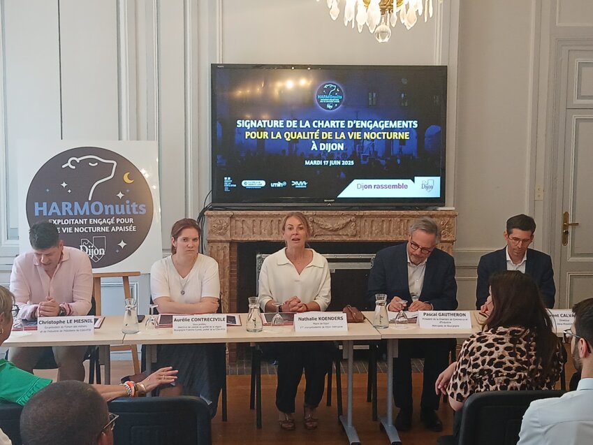 La charte a été notifiée par Nathalie Koenders, Maire de Dijon, Aurélie Contrecivile, Directrice de cabinet de la préfecture de la région Bourgogne Franche-Comté, préfecture de la Côte-d’Or, Christophe Le Mesnil, Co-président de l’Union des Métiers et des Industries de l’Hôtellerie de la Côte-d’Or (UMIH), Pascal Gautheron, Président de la Chambre de Commerce et de l’Industrie Métropole de Bourgogne et Laurent Calvalido, Directeur de Divia Mobilités.