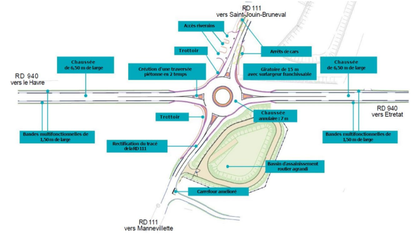 La RD 940, empruntée quotidiennement par 8 000 véhicules en période estivale, sera munie d’une chaussée à 2 voies, d’une largeur de 6,50 m. Des bandes multifonctionnelles seront également mises en œuvre sur les bordures d’une largeur de 1,5 m. Au niveau de la RD 111, le tracé sud sera rectifié afin de réduire la pente au niveau de la liaison avec le giratoire et le carrefour ce qui permettra d’améliorer la visibilité. Une traversée piétonne sera, par ailleurs, aménagée en deux étapes sur la branche du giratoire de la RD940 dans le sens du Havre. Des trottoirs de 1,50 m de large seront réalisés le long de la RD111 et deux arrêts de cars avec des quais accessibles aux personnes à mobilité réduite et de nouveaux abris sont envisagés.