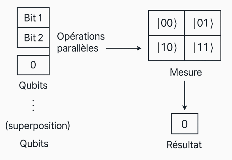 Pour rappel, le quantique utilise une unité appelée le « qubit » (quantum bit) qui permet la combinaison et représentation linéaire et simultanée de deux états à la fois : 0 ou 1, ou « 0 et 1 » - ce qui démultiplie, à la puissance ’n’, les possibilités de calculs simultanés en superposition (2ⁿ états pour n qubits).