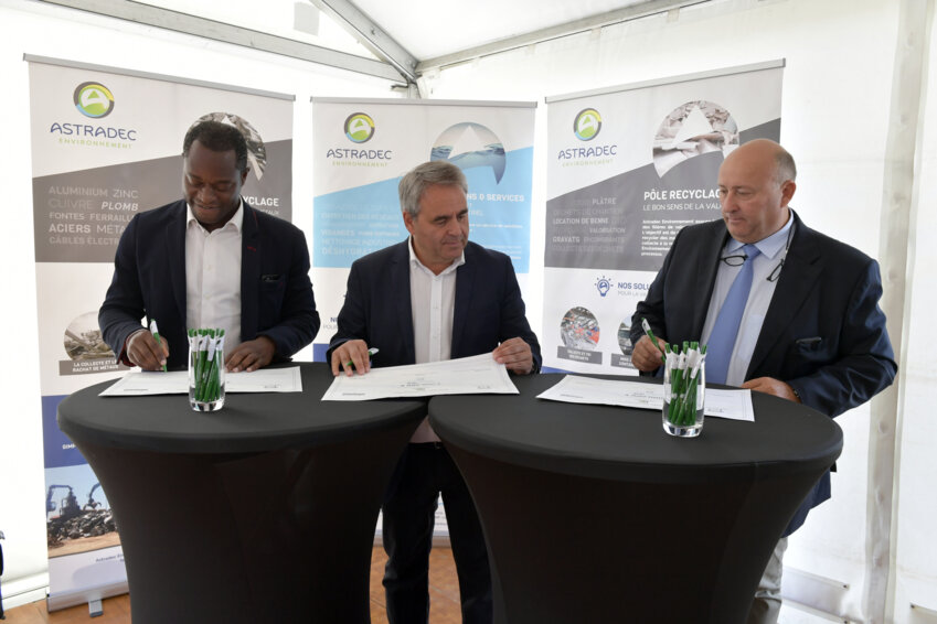 De gauche à droite : Sylvain Makaya du Fonds Idinvest-Isia ; Xavier Bertrand, président du conseil régional des Hauts-de-France, et Eric Bée, dirigeant d’Astradec Environnement lors de la signature. © P. Dapvril-Région Hauts-de-France