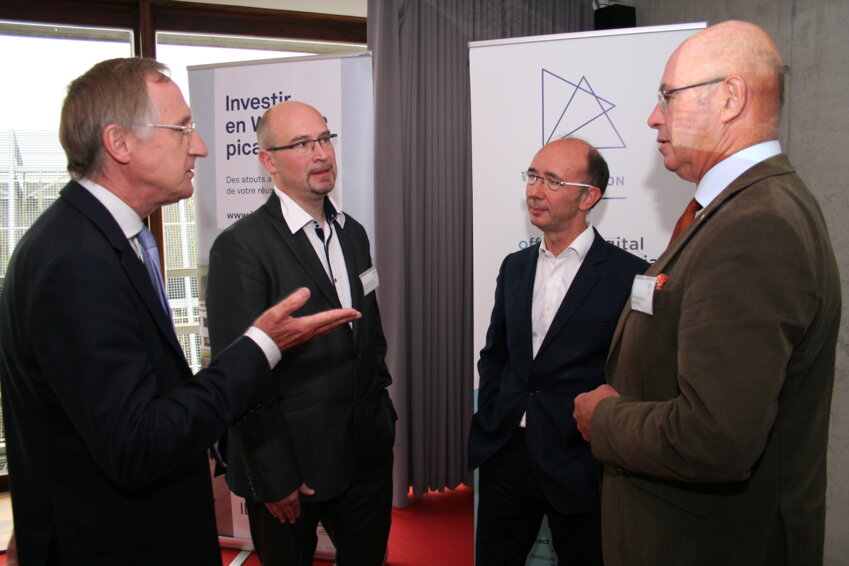 De gauche à droite, Marcel Miller, directeur général d’Alstom Benelux, Denys Bornauw, directeur de Digital Attraxion, Rudy Demotte, bourgmestre de Tournai, et Roby Van Daele, président de Digital Attraxion.