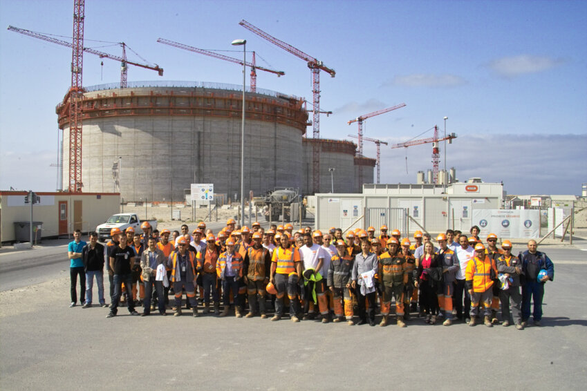 L'équipe Bouygues TP devant les trois réservoirs de GNL en construction sur le chantier du terminal méthanier.