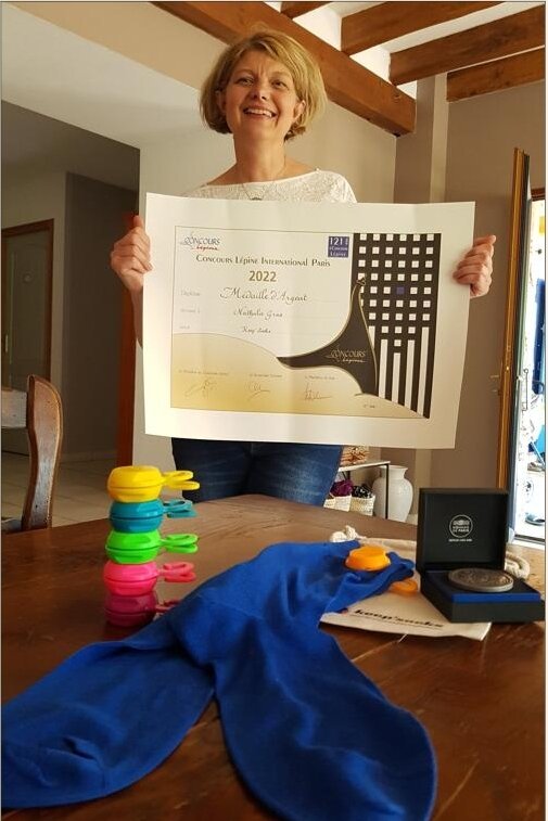 En parallèle de ces deux années de recherche, l’inventrice dépose un brevet et sa marque française, Keep’Socks, se félicitant que l’ensemble du processus, de l’idée à la réalisation, se trouve en France et même sur son territoire. « Devant les sollicitations, je me fais aider par l’ESAT de Crissey pour l’assemblage. » Du 28 avril au 9 mai 2022, elle participe au célèbre salon Lépine pour présenter son invention et espère une certaine reconnaissance. Avec succès, puisqu’elle obtient une médaille d’argent dans la catégorie art de vivre qui compte 365 candidats mais seulement huit femmes.