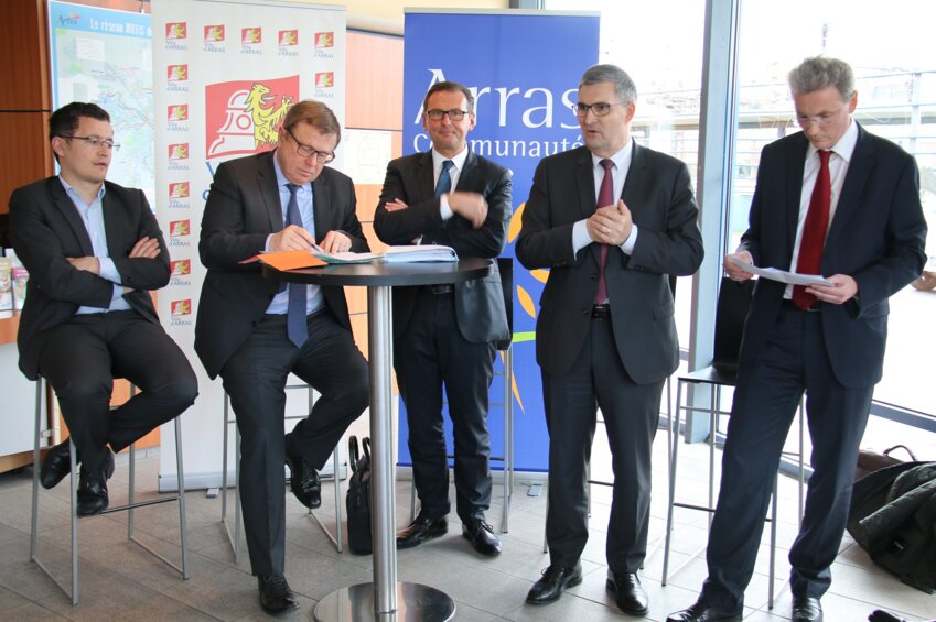 Lors de l’annonce, les intervenants de g. à dr. : Gérald Darmanin, vice-président régional aux transports, Frédéric Leturque, maire d’Arras et conseiller régional, Philippe Rapeneau, président de la Communauté urbaine d’Arras et vice-président régional.