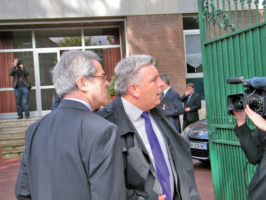 Frédéric Cuvillier, ministre des Transports et de l’Economie maritime, et François Delagrange, directeur du cabinet de Daniel Percheron, le président du Conseil régional, en visite à Calais le 7 juin dernier.