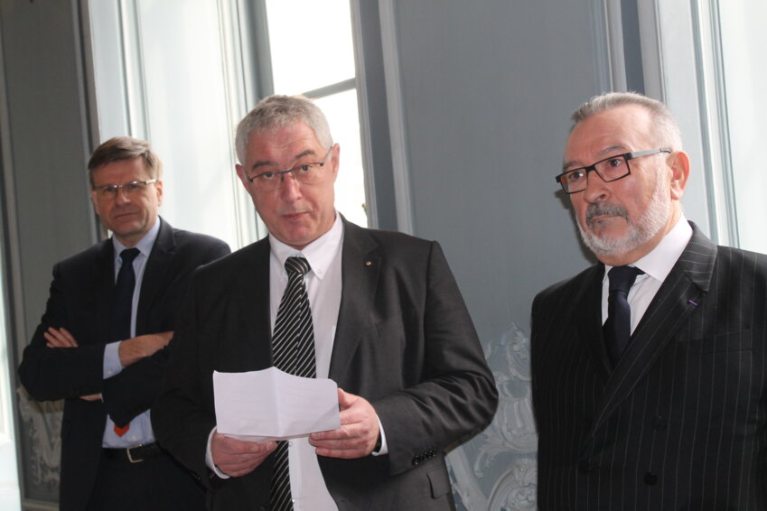Au centre, le président en exercice de la Compagnie régionale des commissaires aux comptes, Régis Gourlet, avec à sa gauche son prédécesseur, le Lillois Gauthier Perthame, et à sa droite Pierre Poujol, parrain de la promotion et lui-même ancien président de la CRCC.