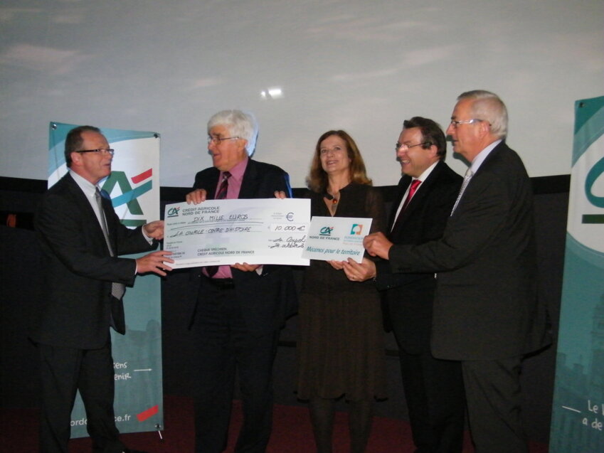 Remise de chèque, le 24 octobre dernier, par la fondation du Crédit agricole pour la reconstitution d’une rampe de V1 à la Coupole d’Helfaut.
