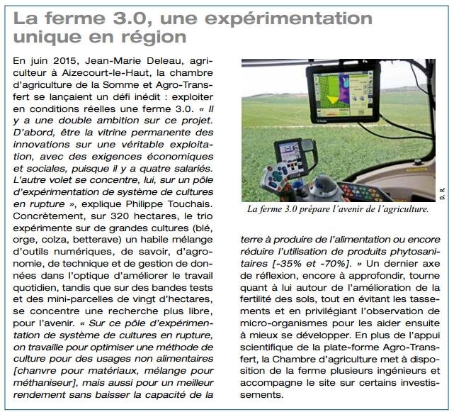 Un an après son inauguration, la ferme 3.0 d’Aizecourt-leHaut (voir encadré), qui souhaite mettre la révolution numérique au service des exploitations agricoles, a ouvert une nouvelle fois ses portes. Cette année, le site a fait le choix de privilégier la technique avec des démonstrations et des présentations d’innovations utilisées in situ. « C’est une journée ouverte à tous, même si l’on vise particulièrement les agriculteurs », confie Philippe Touchais, chef du service productions végétales-agronomie au sein de la chambre d’agriculture de la Somme, avant d’ajouter : « Nous souhaitons aussi conforter l’ancrage de la ferme qui est portée par un exploitant de la Somme, mais qui a une dimension régionale. » 1 500 agriculteurs ont participé à l’événement.