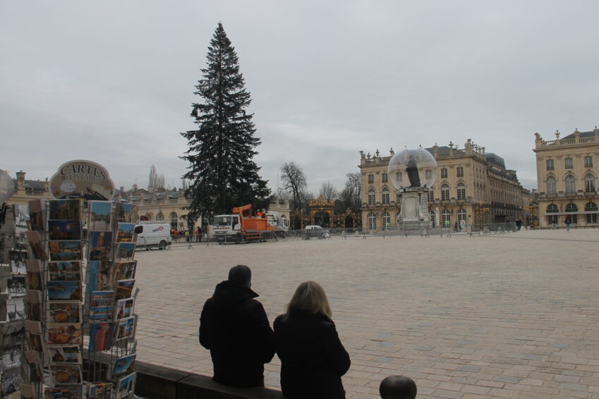 Une carte postale de confinement ! Le temps est presque suspendu en ce lundi de fin novembre sur la place Stanislas à Nancy. Le sapin, fraîchement installé, commence à se parer de lumière tandis que la bon Roi Stan s’est mis dans sa bulle (imparable pour lutter contre la Covid-19). Le couple de Nancéiens profite de leur heure de sortie pour savourer cet instant particulier tout en pensant à l’après…