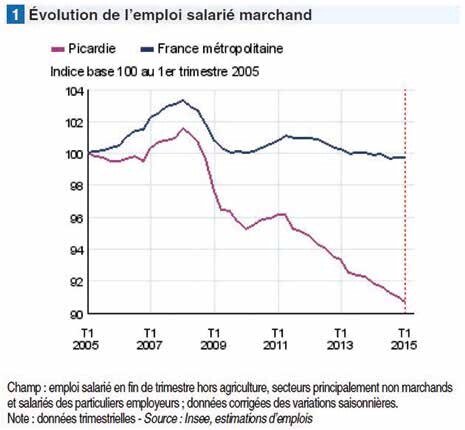 Alors qu’une certaine stabilisation de l’emploi sur le plan national laisse entrevoir une reprise des embauches dans les prochains mois, la contraction de l’emploi marchand en Picardie se dégrade avec, au premier trimestre 2015, la suppression de 1 600 postes, soit un recul de 0,4% du nombre de salariés.