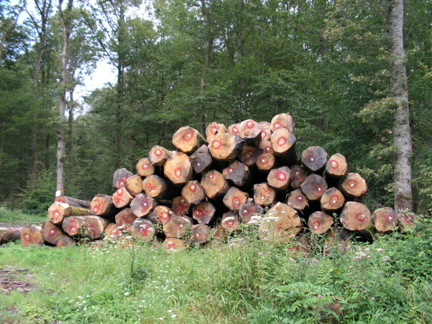 Des troncs coupés en attente dans la forêt domaniale de Mormal dont l’exploitation économique est organisée par l’Office national des forêts.