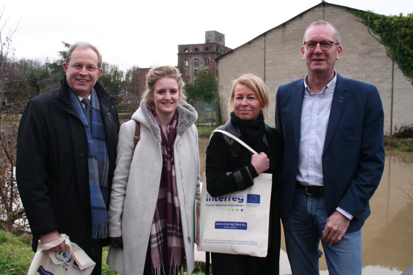 (De g. à d.) Joël Duyck, maire de Merville et président de Lys sans frontières, Elizabeth Boulet, conseillère régionale déléguée aux fonds européens, Valérie Grimbert, directrice de Lys sans frontières, et Geert Hoorens, chargé de mission à Toerisme Leiestreek, posent devant le site où sera aménagé le futur embarcadère.