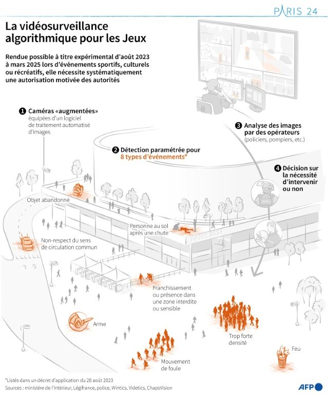 Ces caméras "augmentées" équipées de logiciels d'analyse d'images "ont pour finalité de détecter en temps réel des événements prédéterminés", a défini la loi "Jeux Olympiques et paralympiques" adoptée par le Parlement mi-avril 2023.