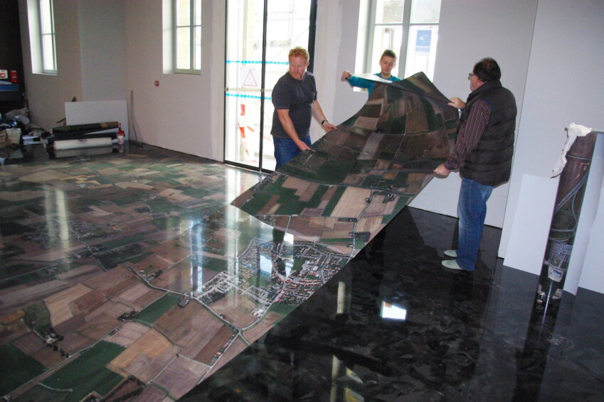Choisie par l’architecte du chantier pour son caractère «innovant», l’entreprise Crouzet a étudié minutieusement le challenge. «Au départ, on a un sol béton avec une partie carrelée. On a dû recouvrir d’un réagréage béton avant les poses suivantes», explique Jean-Maurice Morque, dirigeant de la PME roubaisienne. Le bureau d’études, après quelques essais, découvre qu’il faut un primaire en résine noir plutôt que blanc «pour l’effet contraste de la photo». Une seconde résine vient recouvrir le sol qui va accueillir «la toile». Avec une contrainte forte : les passages incessants − on compte notamment plus d’une centaine de mariages par an… La carte ne doit pas s’effacer avec le temps.