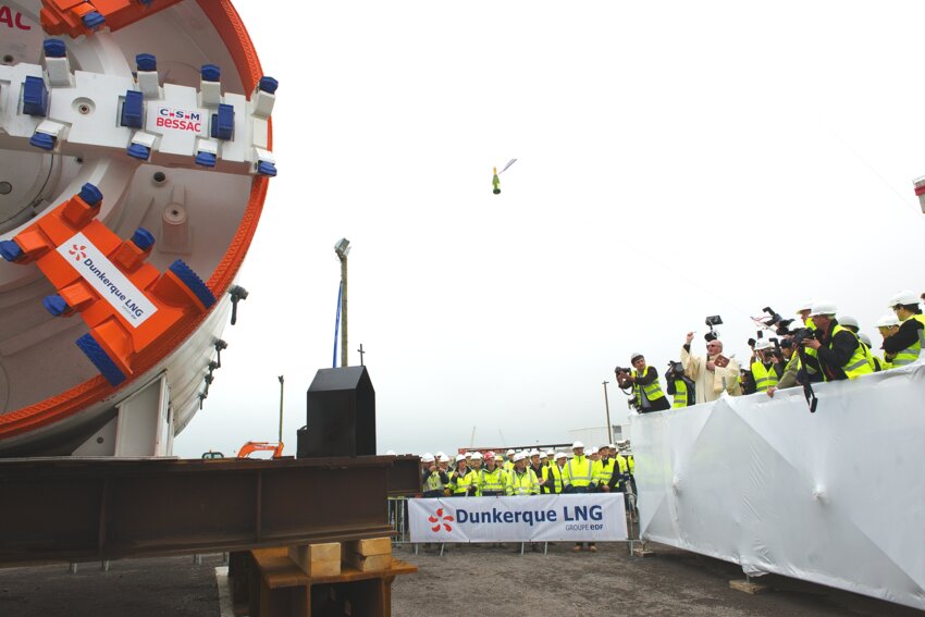 Le 30 mai a été le jour de baptême du tunnelier nommé «Joséphine la Peule» du nom de sa marraine. La cérémonie s’est déroulée à partir de 14h30 sur le site du terminal méthanier du Clipon à Loon-Plage. Dunkerque LNG, filiale du groupe EDF, porteur du projet, a vu en la proximité de la centrale nucléaire de Gravelines l’opportunité de réchauffer le gaz GNL arrivant à -162° et devant être porté à +3°, grâce aux eaux tièdes de la sortie de cycle de la centrale après refroidissement des réacteurs de cette dernière. Ainsi, 5 à 6% des eaux seront utilisés à cette finalité. Une partie est déjà dédiée à la ferme aquacole toute proche pour l’élevage des bars et dorades royales.
